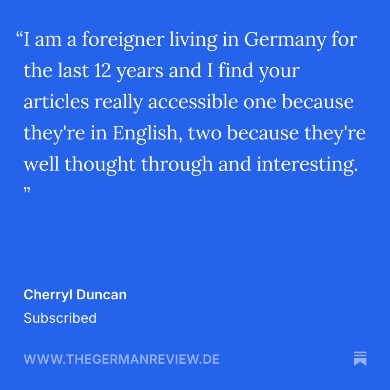 If you subscribe to The German Review as a newsletter, it will arrive in your inbox twice a week, on Wednesdays and 12.00 CET and Saturdays at 12.00 CET. The Saturday edition is available exclusively to paying subscribers. Alternatively, you can check in at our homepage for the latest releases, or download the Substack app to read it on your phone.