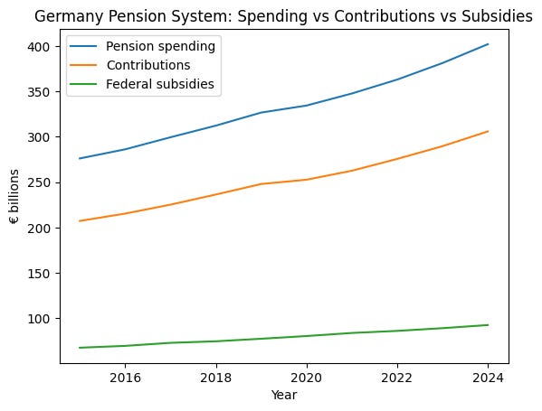 As the baby boomers retire, pension spending has surged. Total expenditure in the statutory system rose from around €276 billion in 2015 to over €400 billion in 2024. Contribution income did rise as well — from roughly €207 billion to just over €300 billion — but nowhere near enough to keep pace.