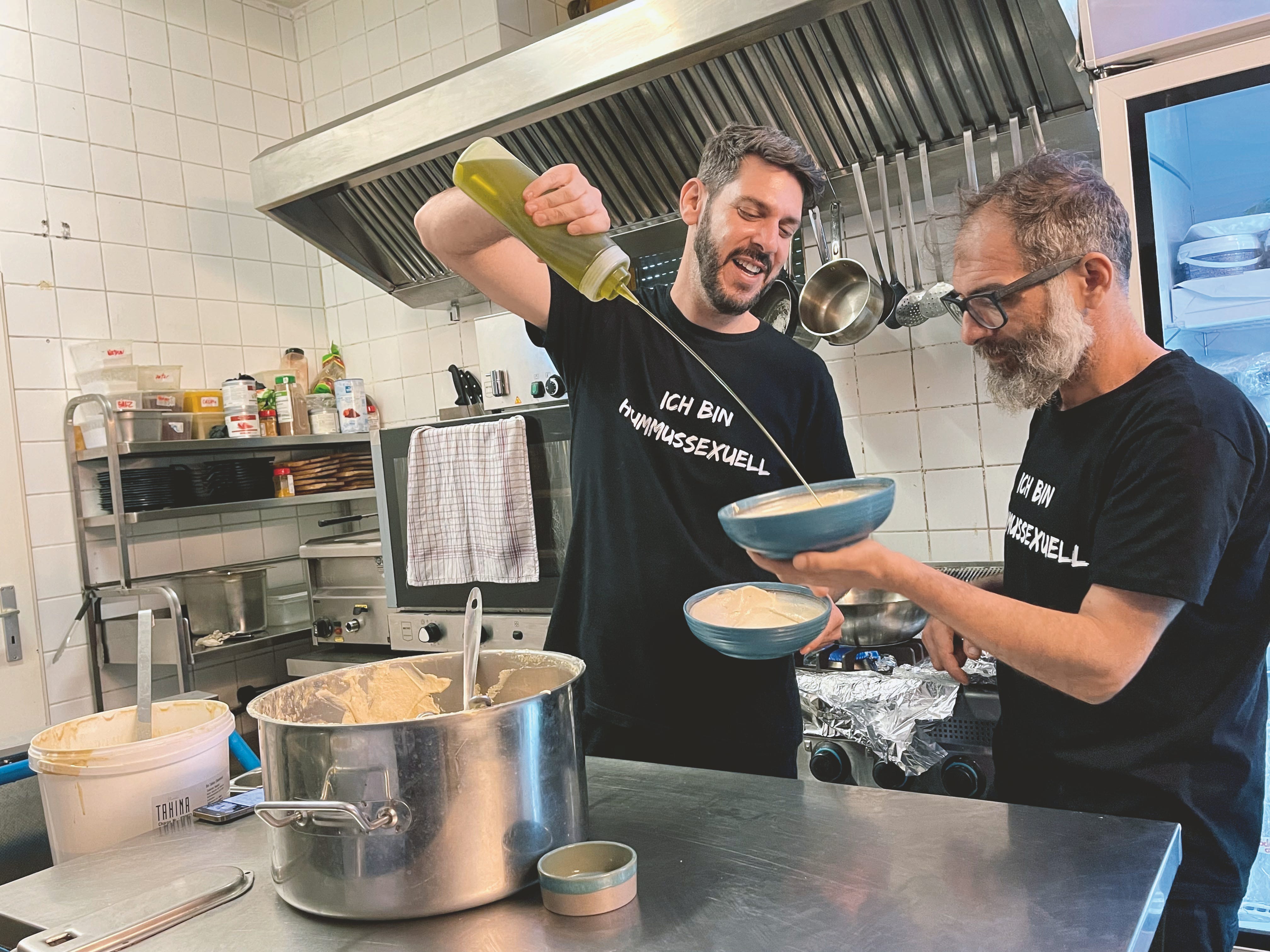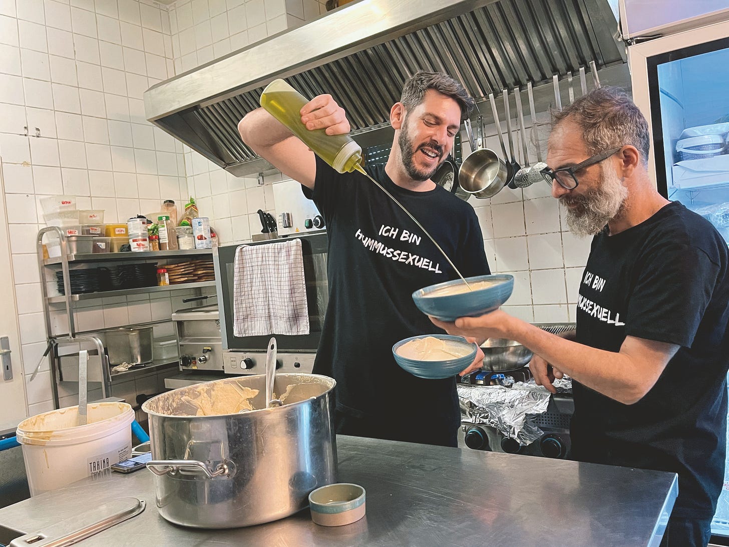 Ben David, 44, and Dabit, 42, making their signature hummus together in the kitchen at Kanaan in November 2023. Photo courtesy of Kanaan.